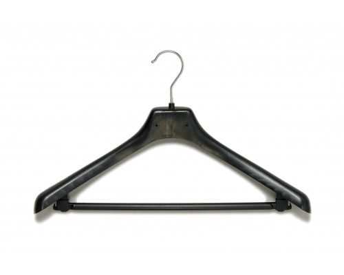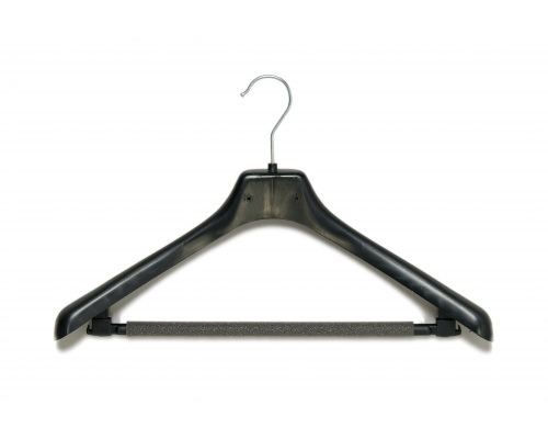 Deze kostuumhanger is speciaal ontworpen met een geïntegreerde broeklat, waardoor zowel boven- als onderkleding netjes en kreukvrij kunnen worden opgehangen. De brede schouders van 40 mm zorgen voor een gelijkmatige verdeling van het gewicht van kledingstukken, wat vervorming voorkomt en de levensduur van uw kleding verlengt. De hanger is ideaal voor diverse kledingstukken zoals colberts, kostuums, mantels en pantalons. Dankzij de stevige constructie is de hanger bestand tegen dagelijks gebruik in zowel particuliere huishoudens als in commerciële omgevingen zoals kledingwinkels en showrooms. De zwarte kleur geeft een professionele uitstraling en past in vrijwel elk interieur. Met de keuze tussen verschillende breedtes kunt u de hanger afstemmen op de specifieke behoeften van uw garderobe of winkelpresentatie.